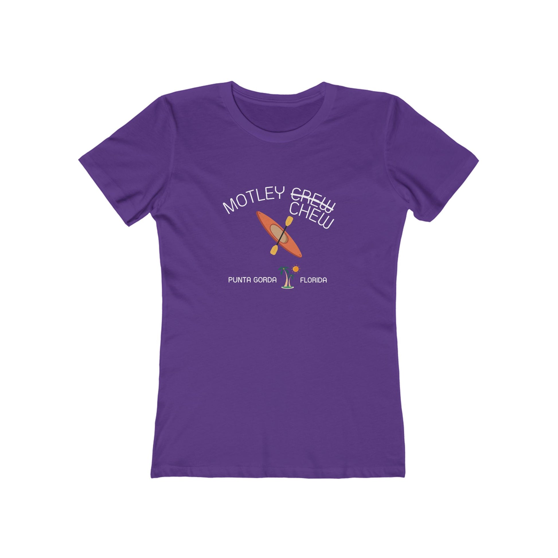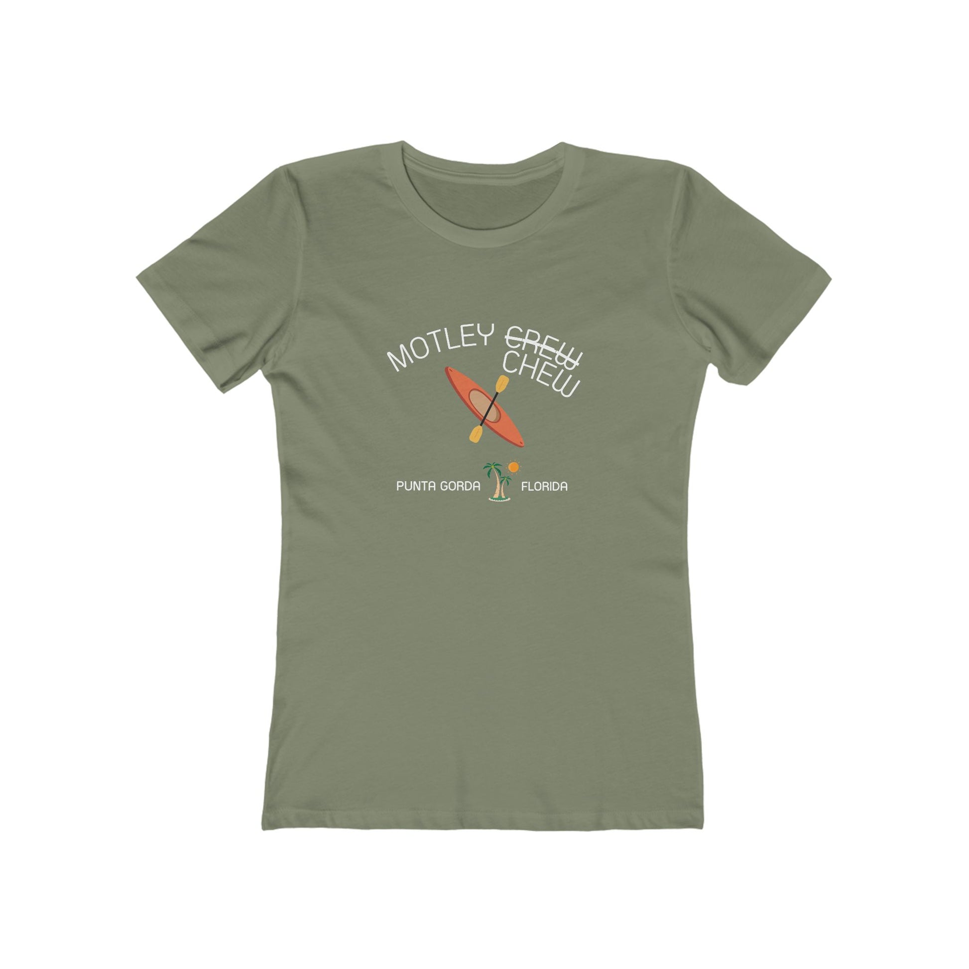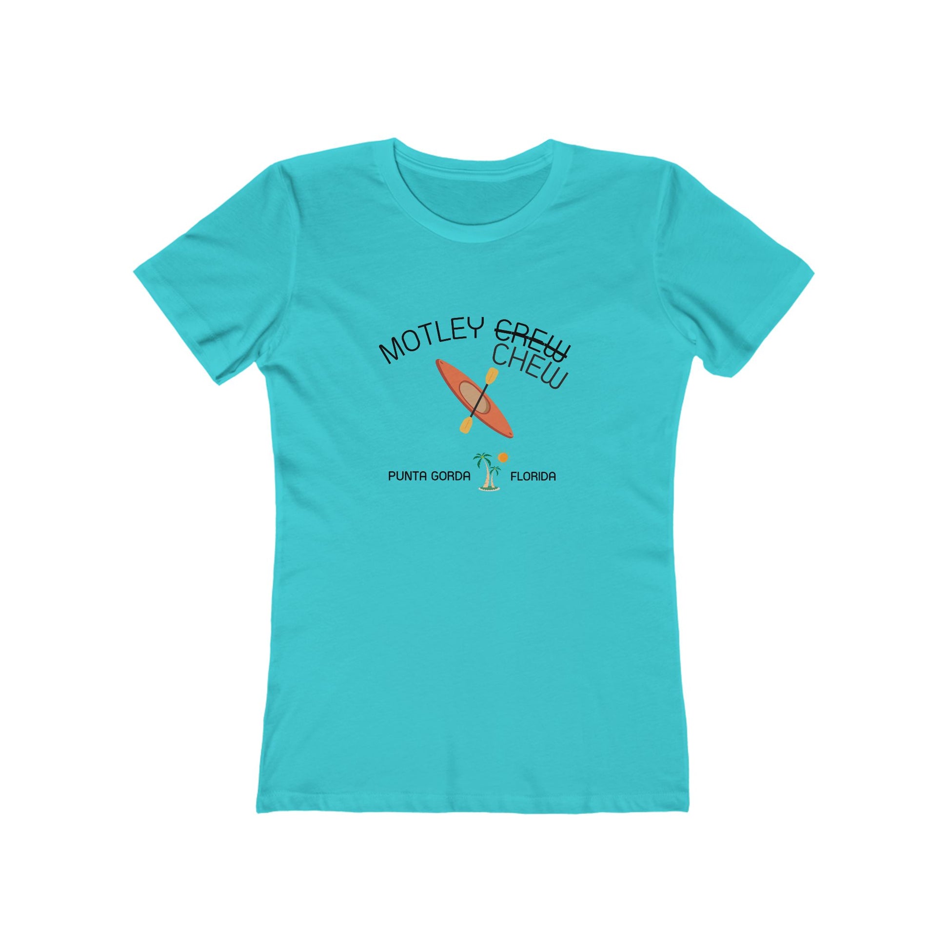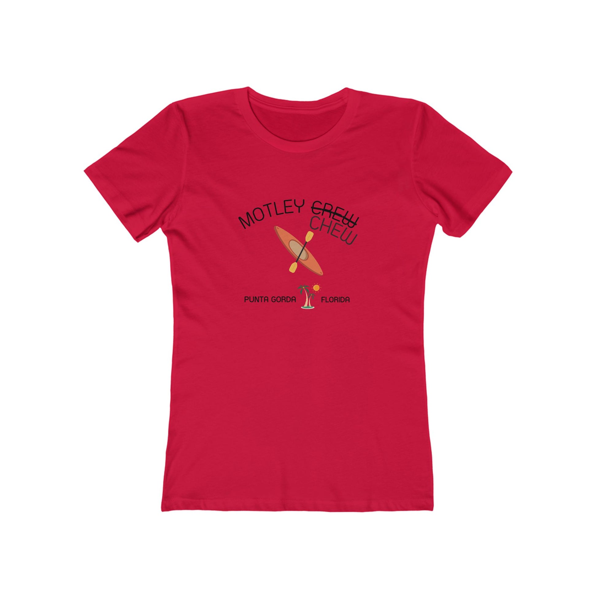 A women's cut custom t-shirt celebrating the Motley Crew kayak club in Punta Gorda, FL who love to eat together!
