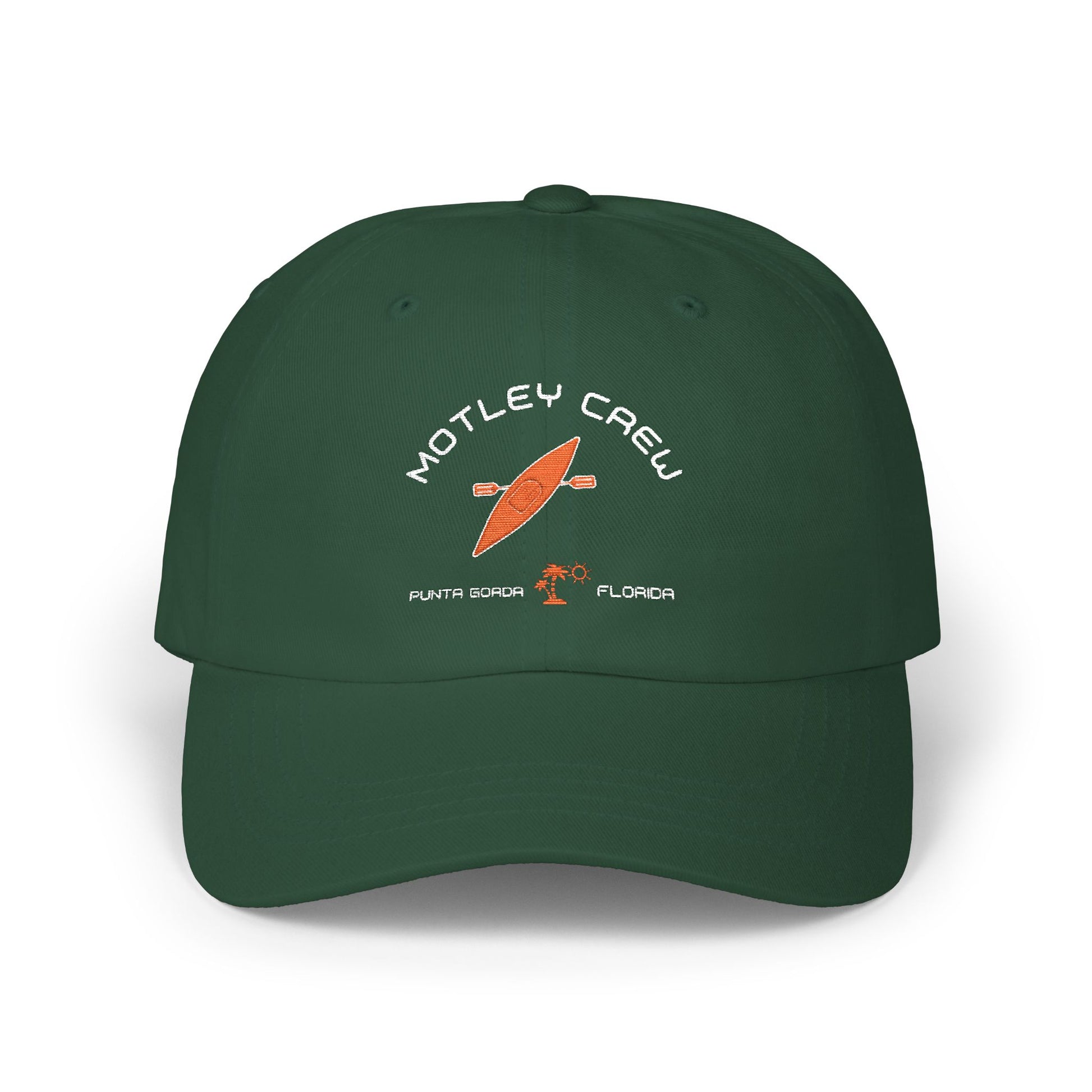 An embroidered logo cap for the Motley Crew Kayak Club from Punta Gorda, FL.