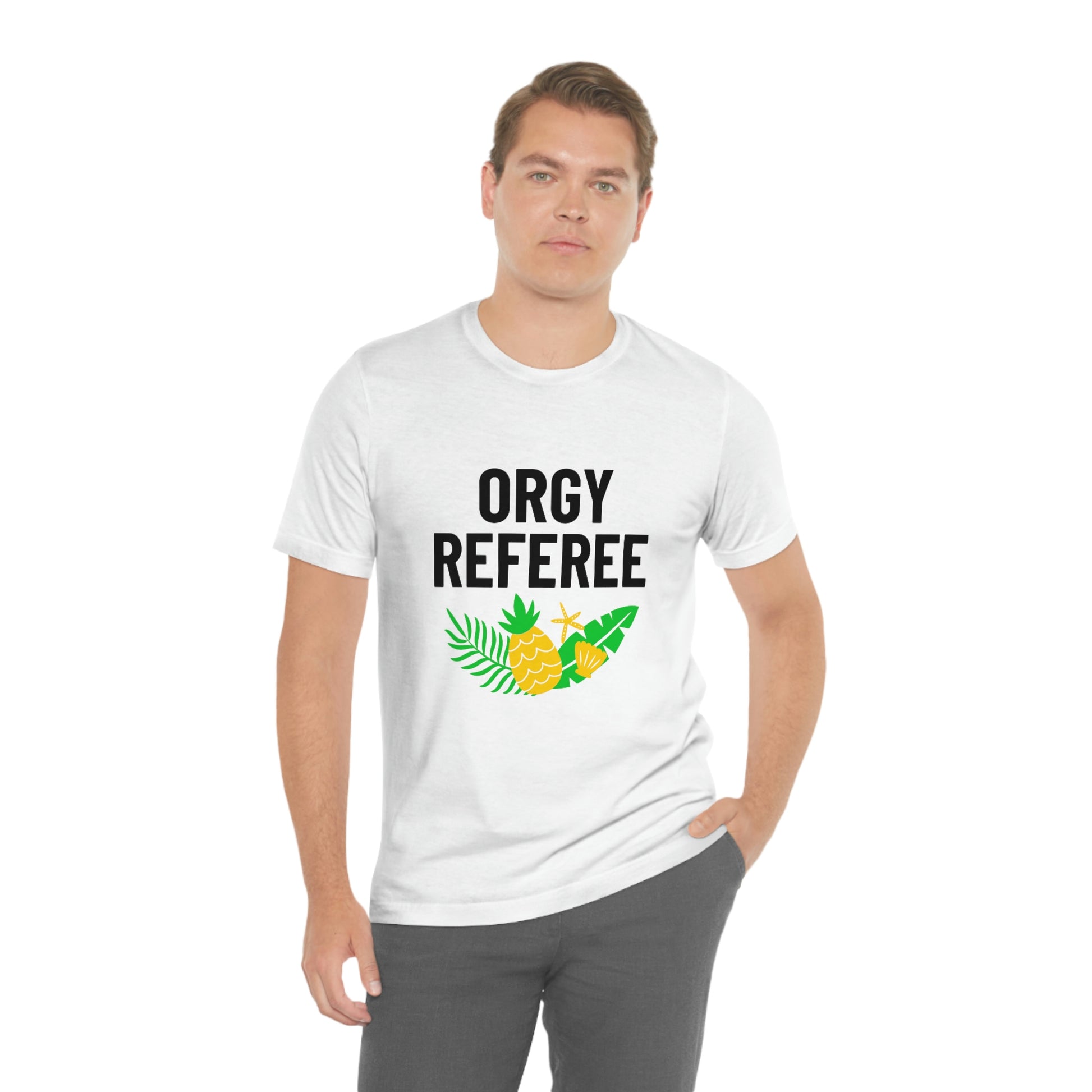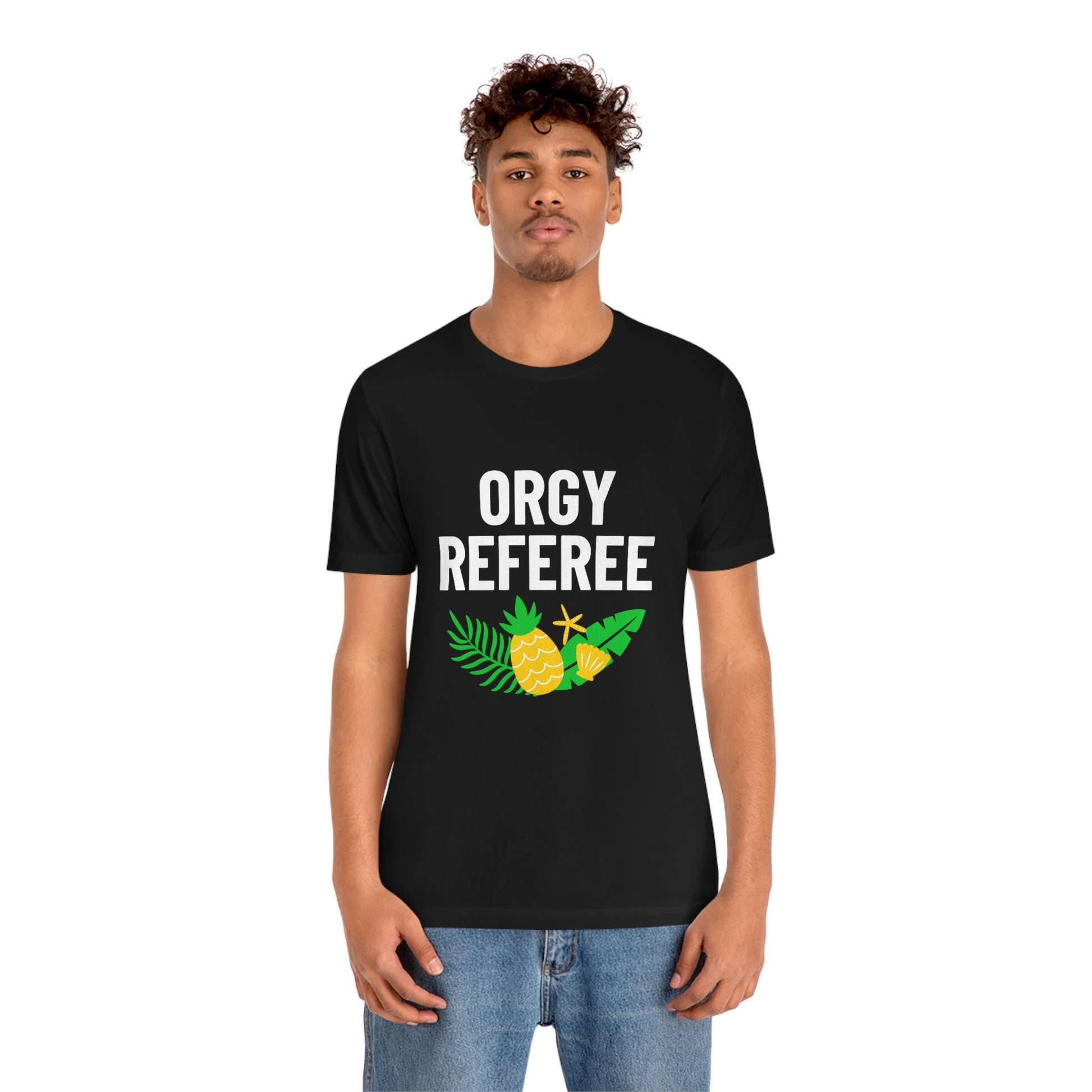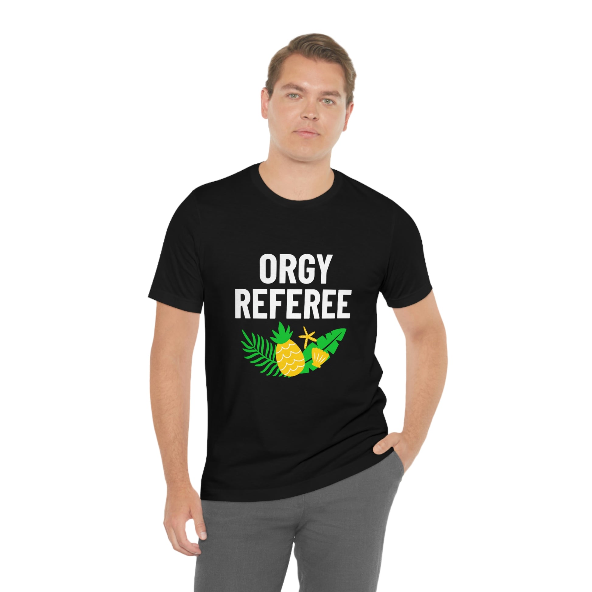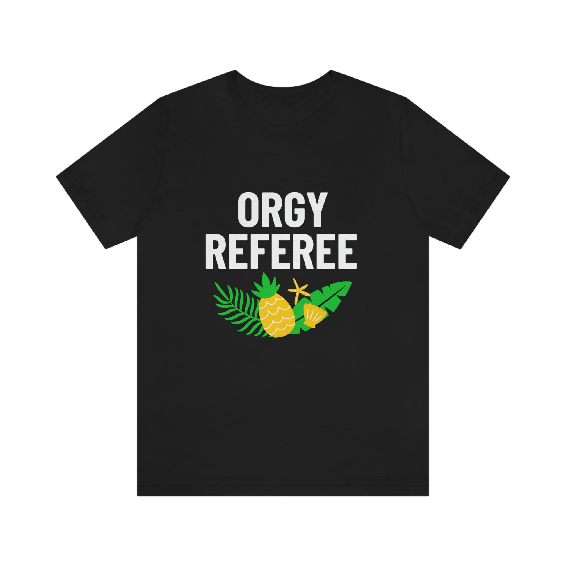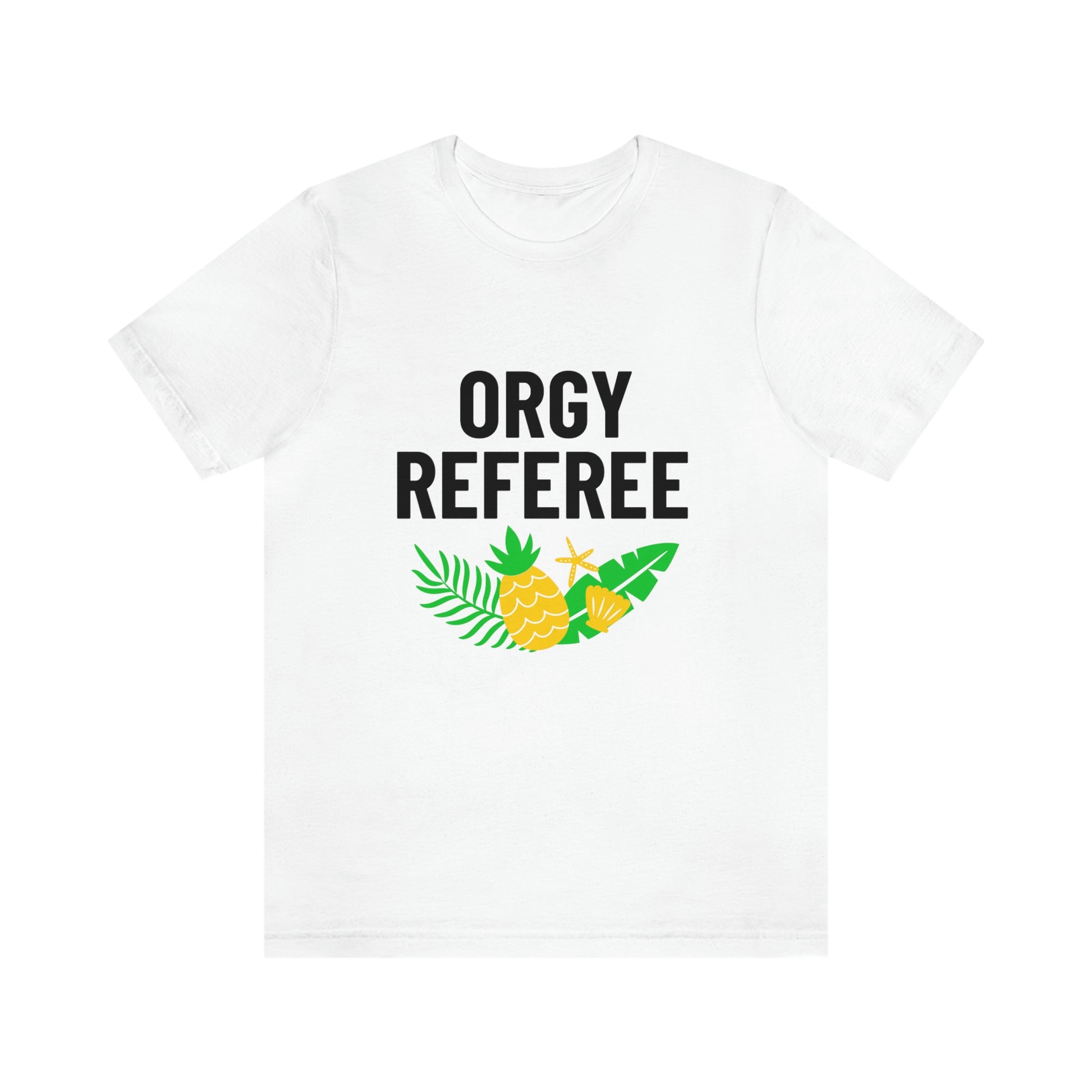 Lifestyle/Swinger themed t-shirt saying "Orgy Referee" with pineapple flair.