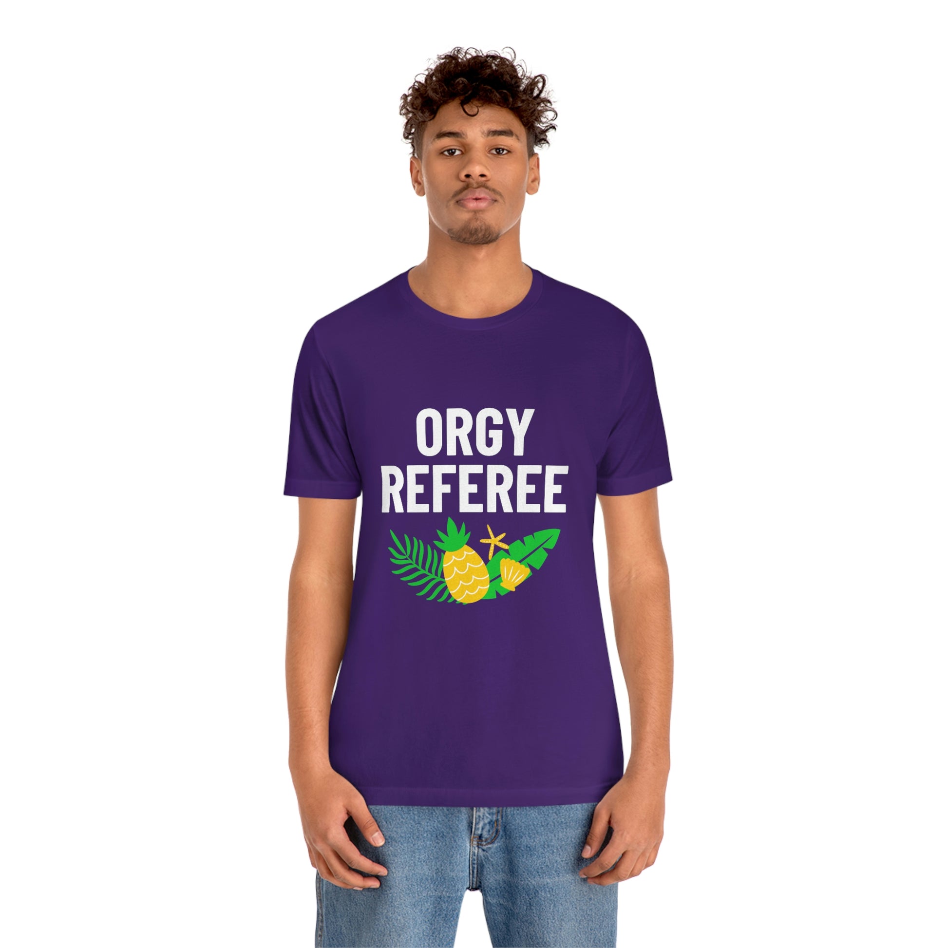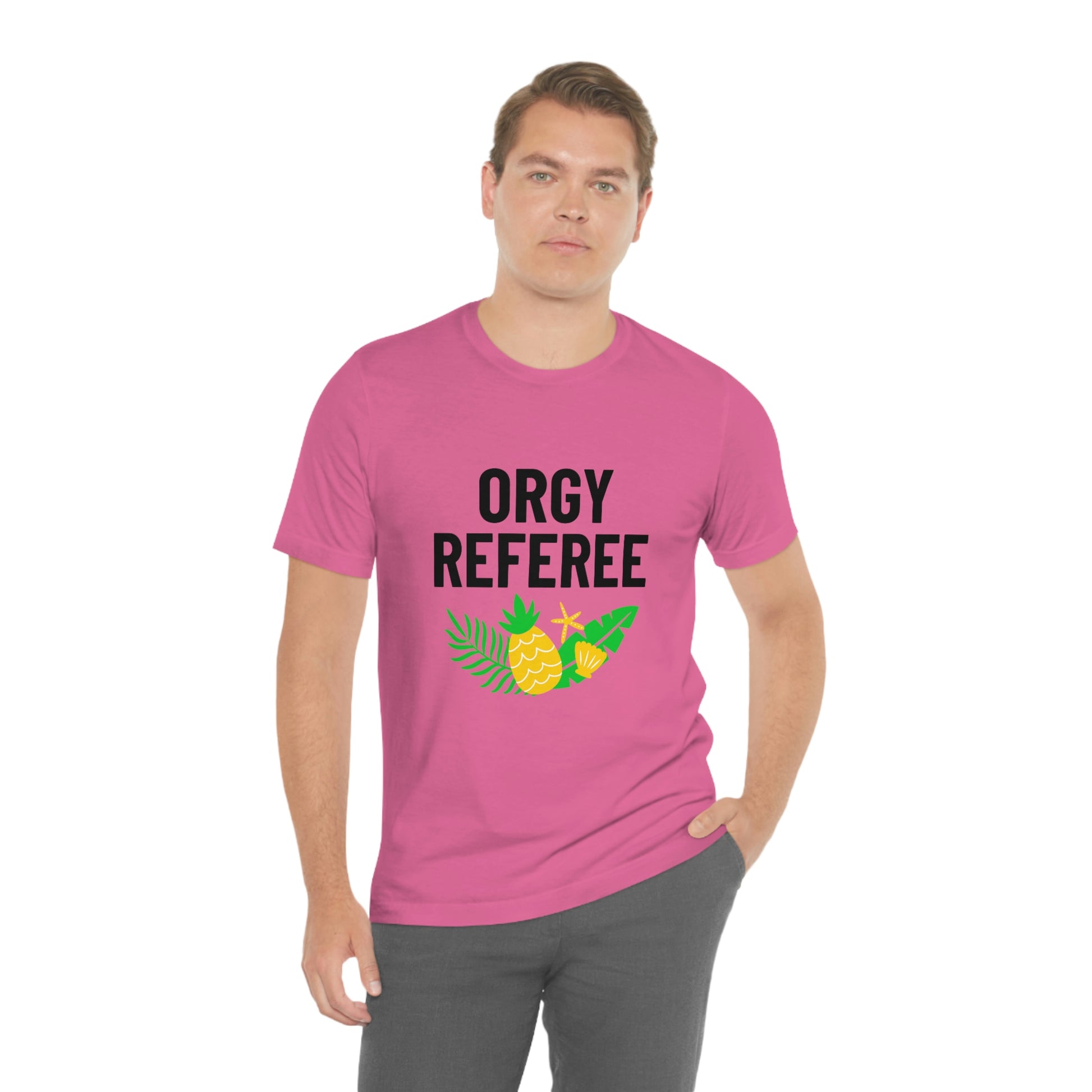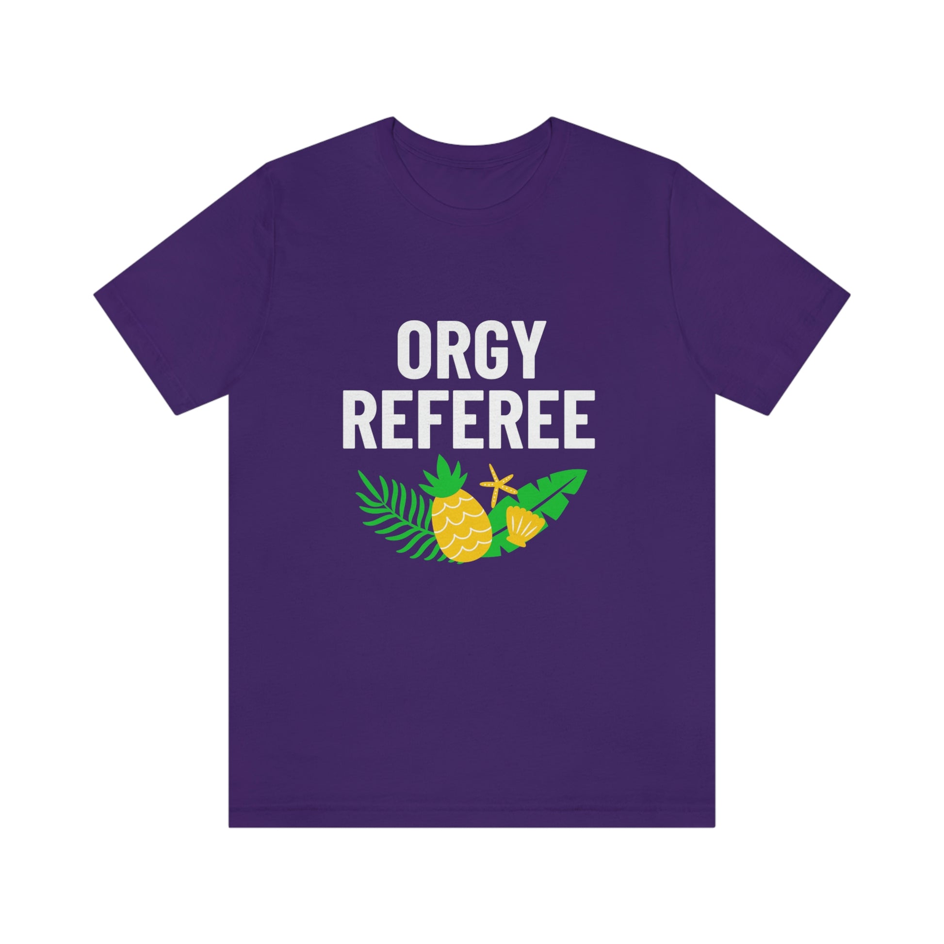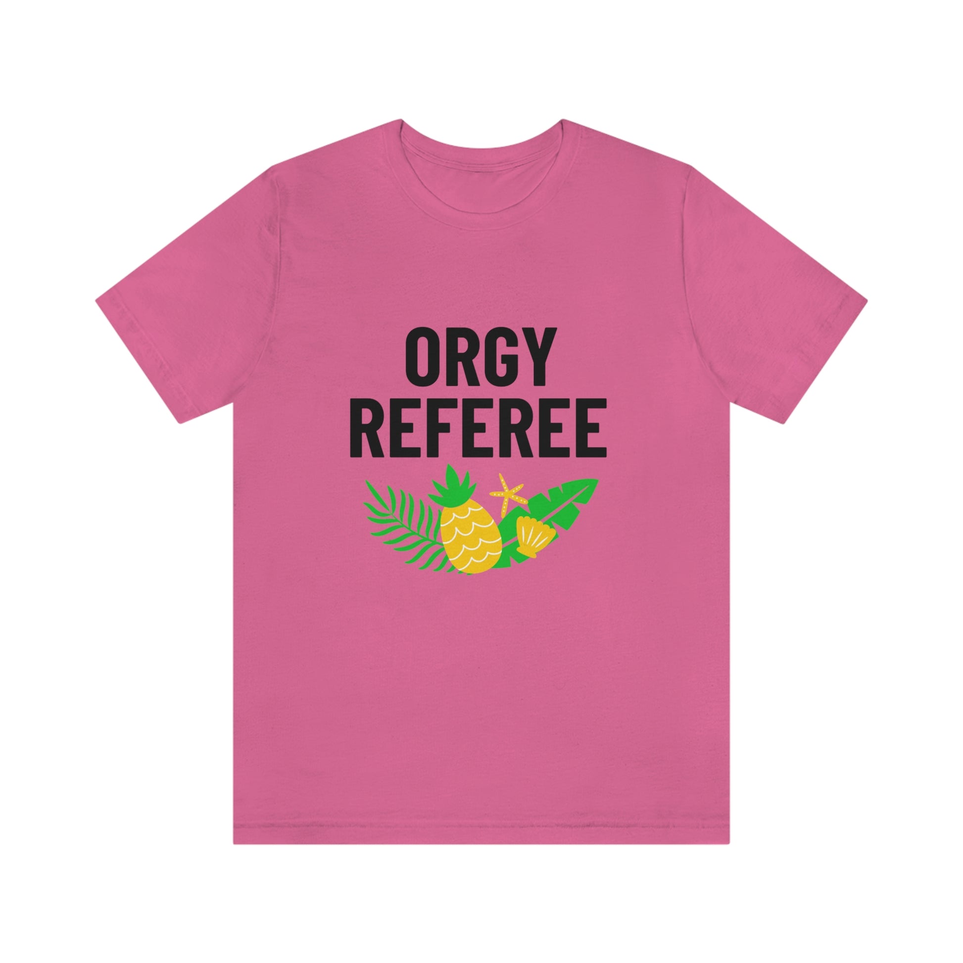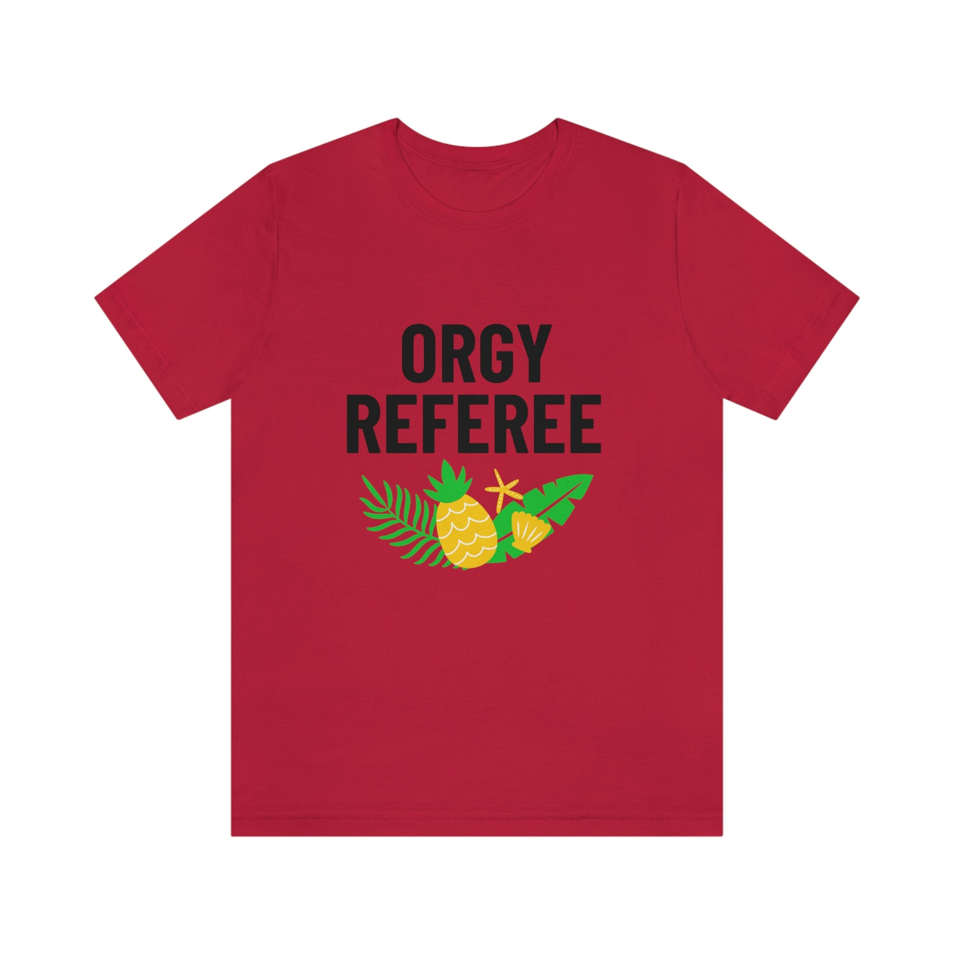 Lifestyle/Swinger themed t-shirt saying "Orgy Referee" with pineapple flair.