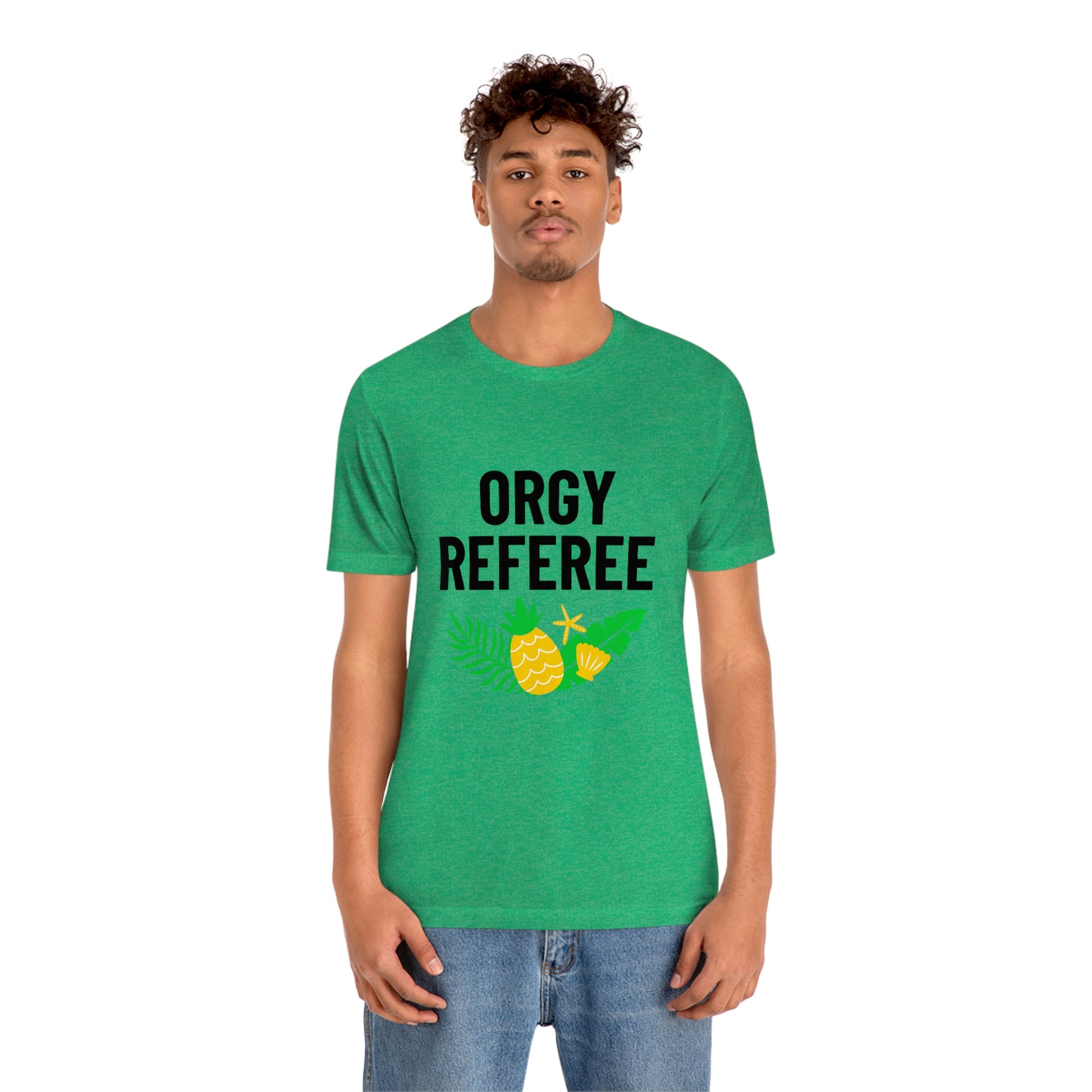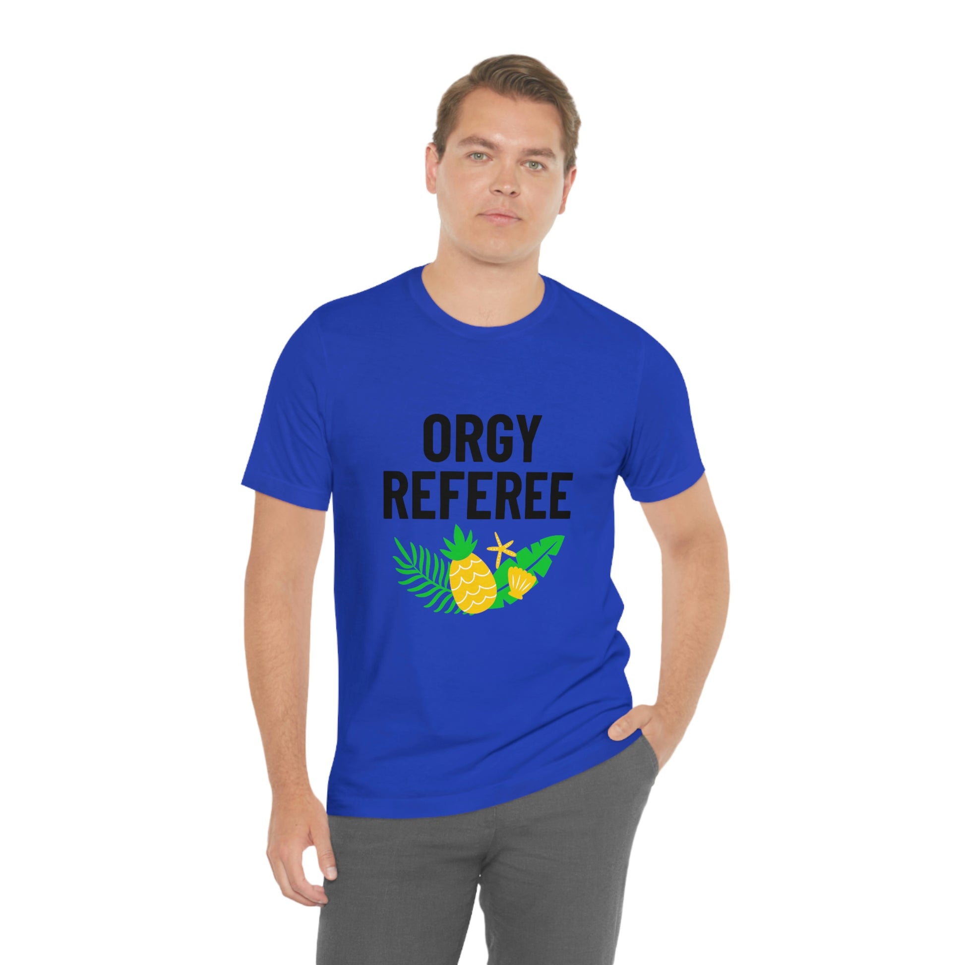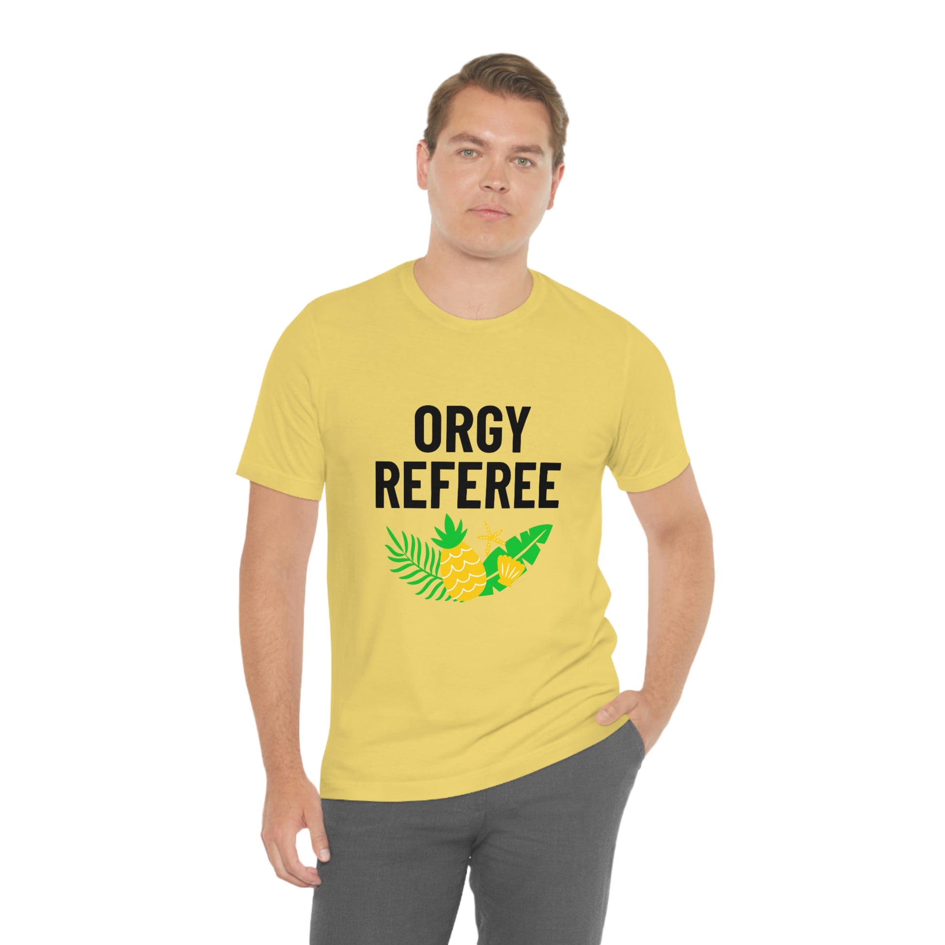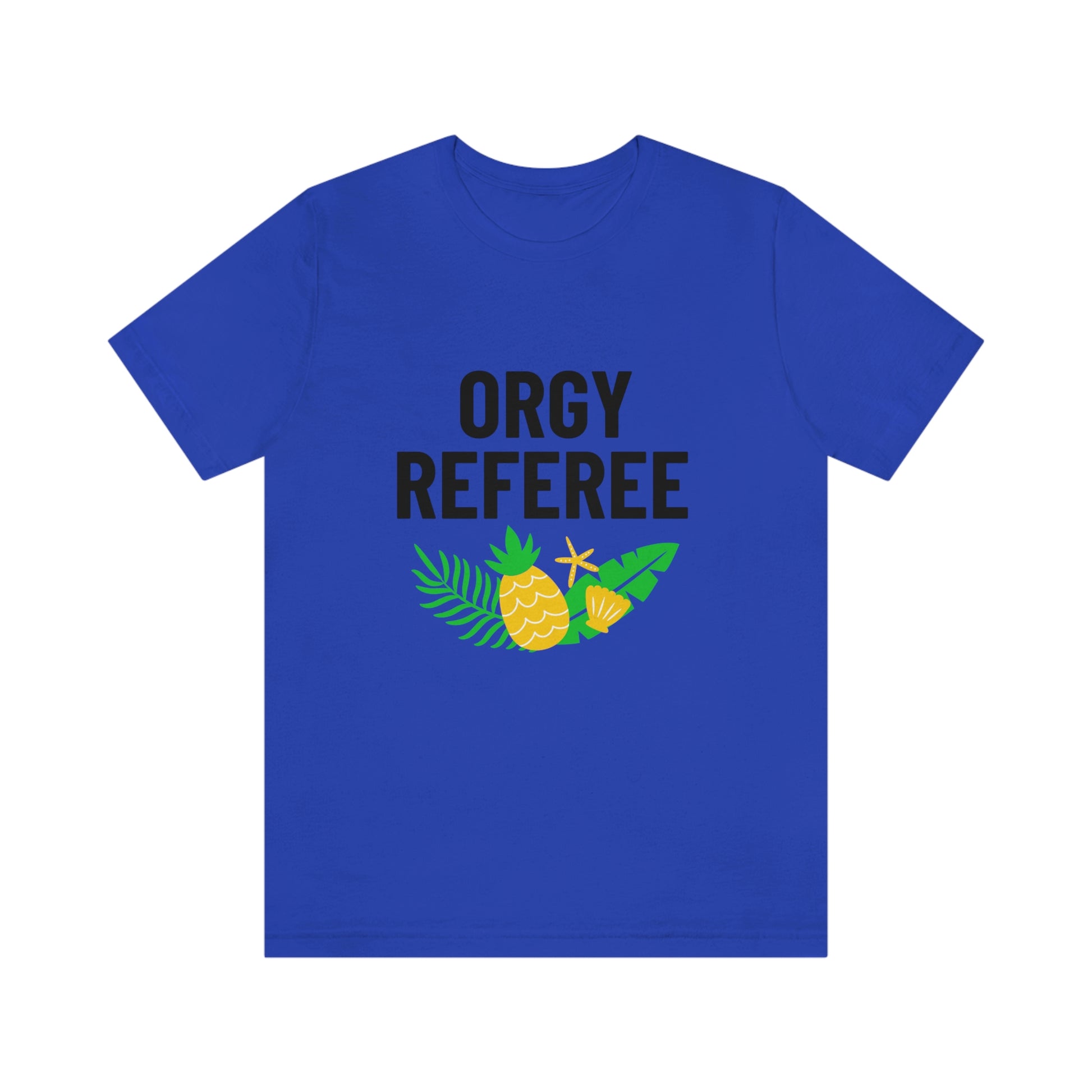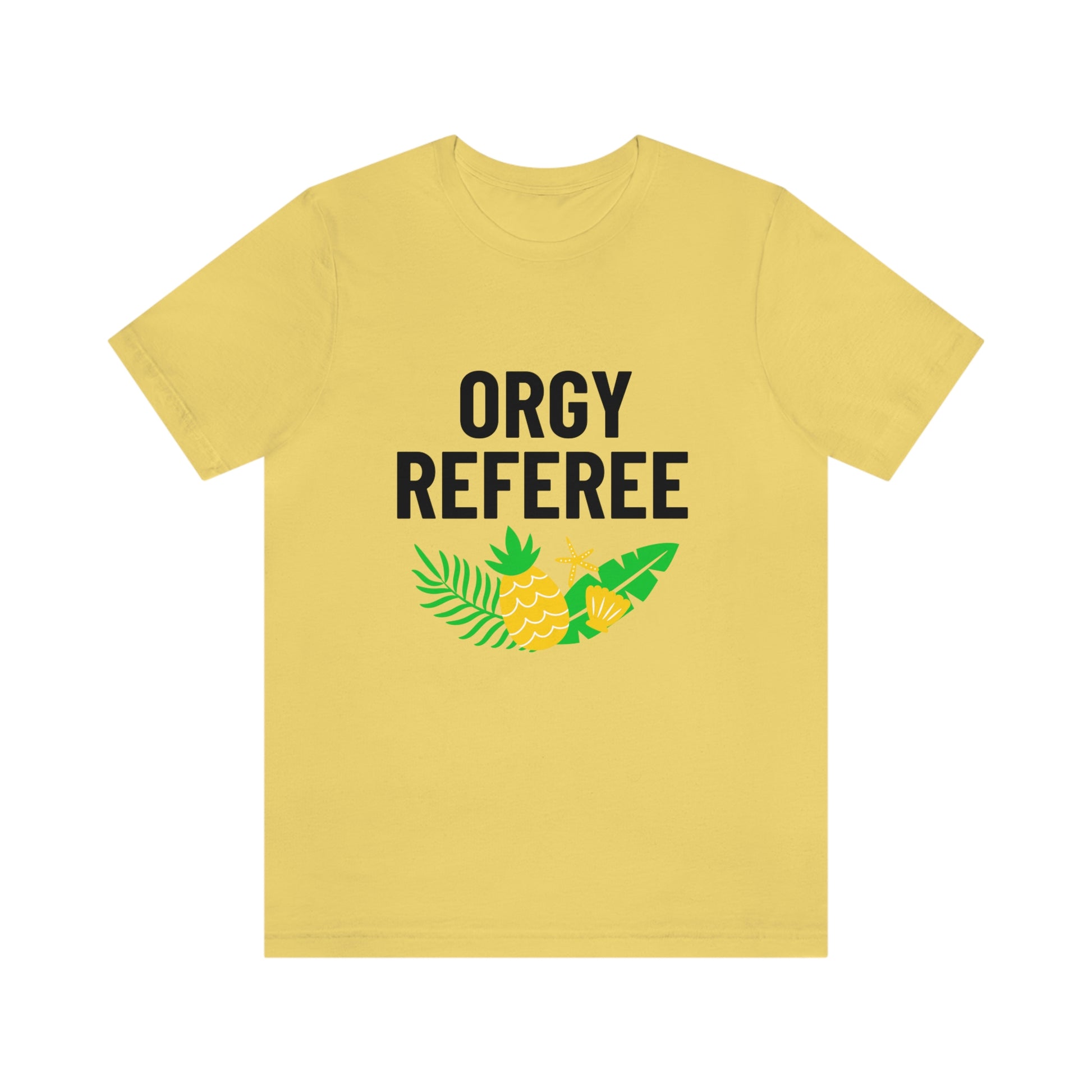 Lifestyle/Swinger themed t-shirt saying "Orgy Referee" with pineapple flair.